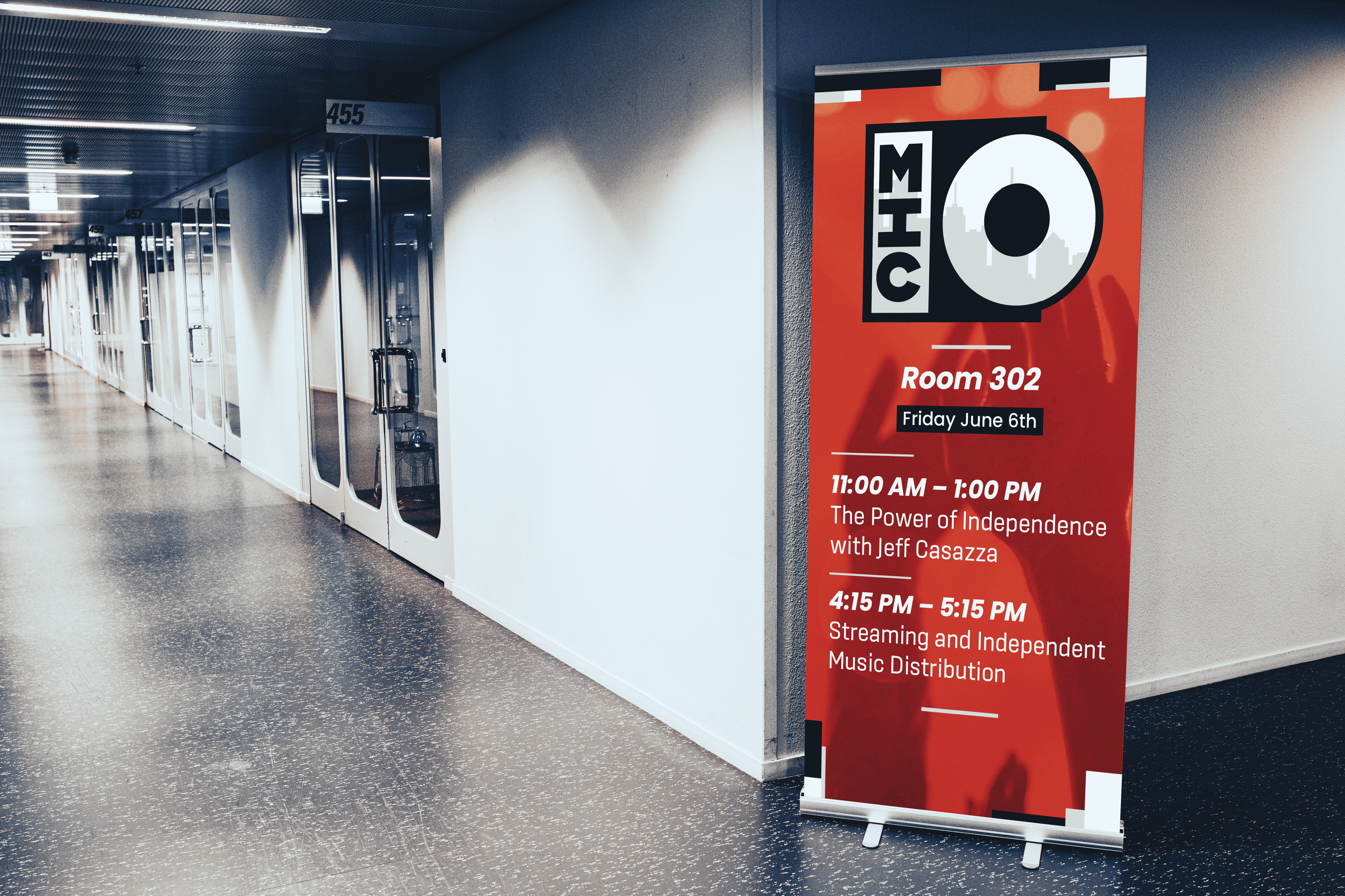This piece is a series including a poster, branding, banners, and product mockups for a Music Conference. The Music Independence Conference empowers independent artists, labels, venues, and industry professionals. The color palette is limited to three colors: red, black, and white. These colors represent independence by adapting and utilizing the unorthodox style that artists like Piet Mondrian helped pioneer, bringing it into a contemporary setting, since independent music is meant to be outside of norms and trends. The MIC logo resembles musical symbology, such as a vinyl record being played or a compact disc. The posters and banners use this style to provide accurate information to convention-goers.